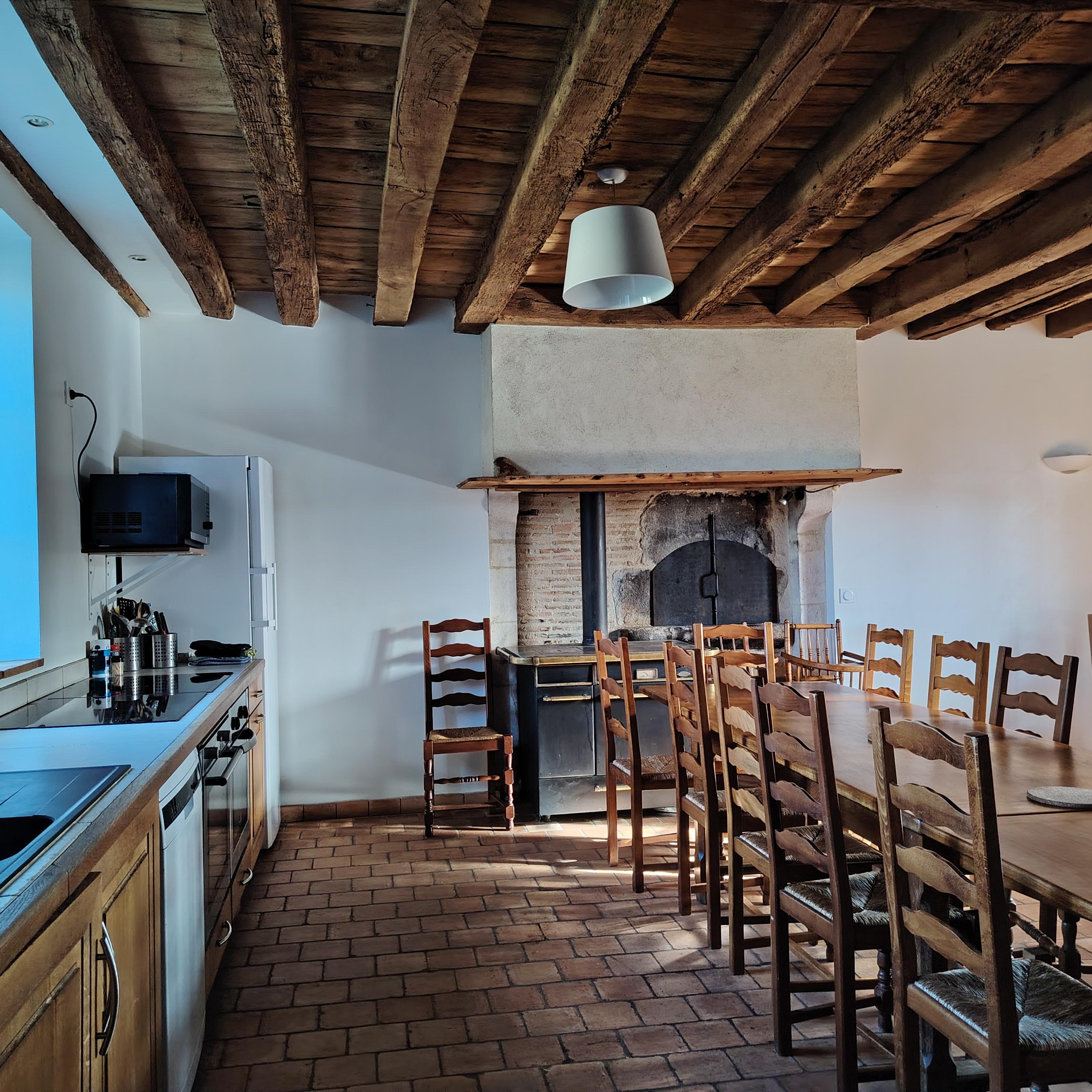 Une cuisine / salle à manger de 20m² environ permet d’asseoir jusqu’à 15 personnes.